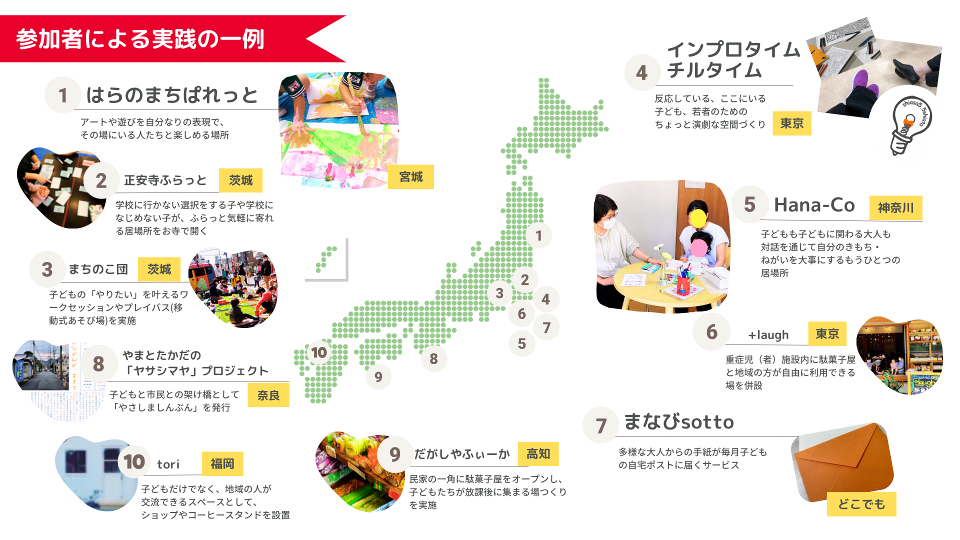たとえば、10代で妊娠・出産を経験したシングルマザーのサポート、 コンビニのイートインスペースや商店街など、 子どもの生活動線上で自然な関わりが生まれる場づくりなど。それぞれの地域で、子どもの声やニーズに寄り添う、小さく多様な取り組みが芽吹き、広がり続けています。
