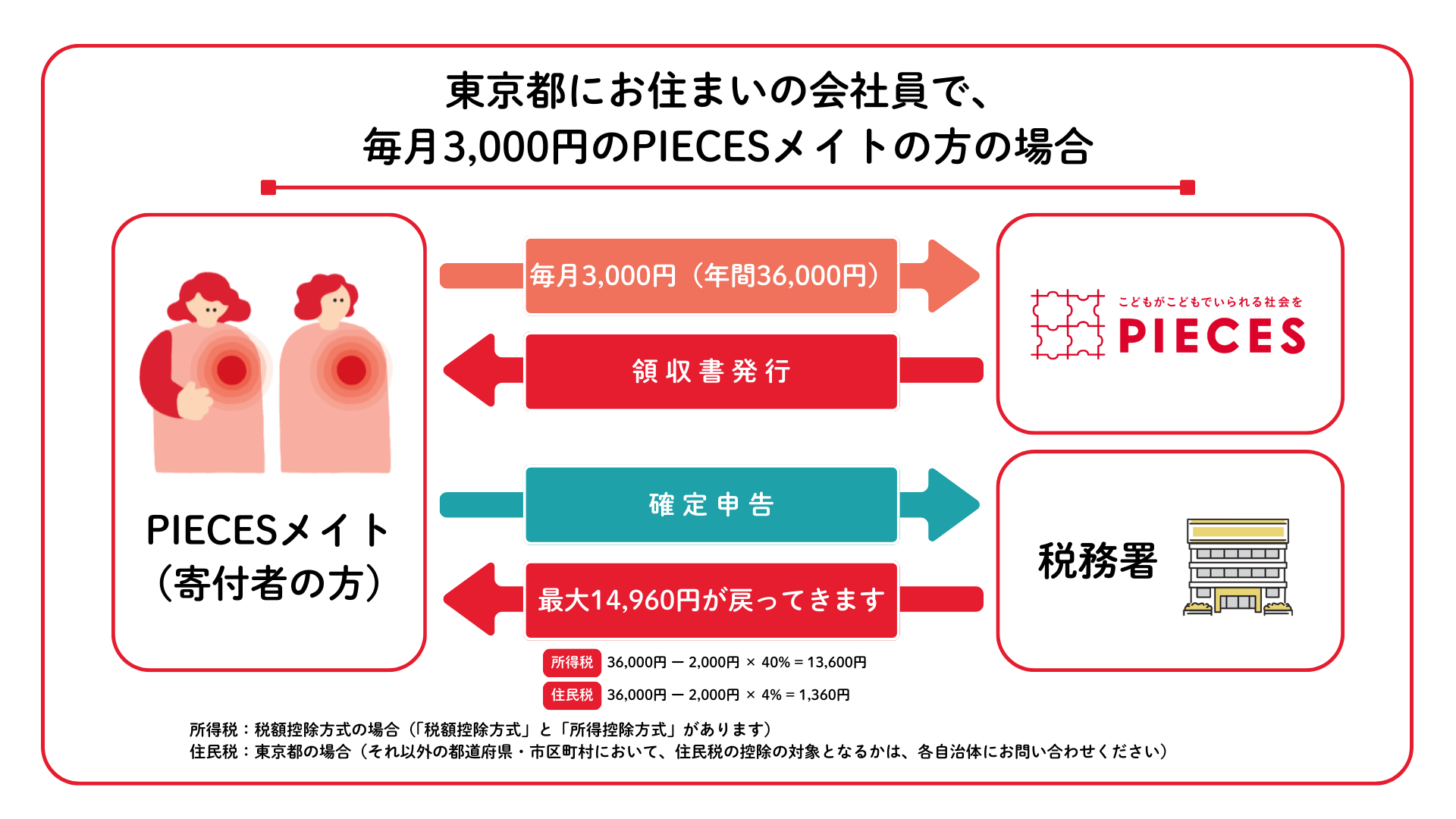 PIECESに対するご寄付は税制優遇の対象となります。個人の方からのご寄付は確定申告を行っていただくことで、寄付金額の約40%が税控除されます。