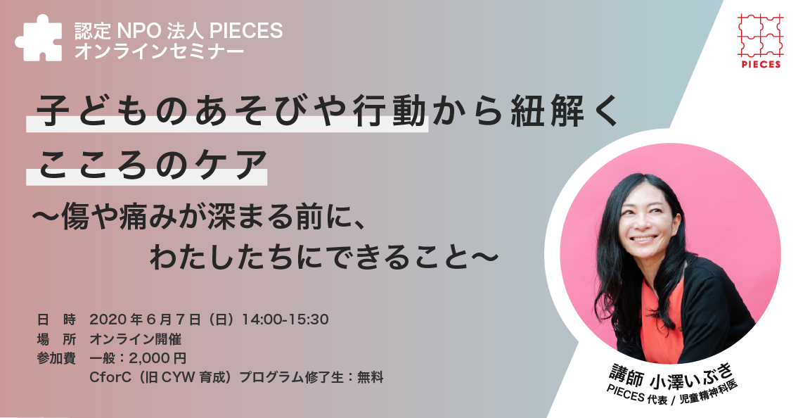 PIECESはこれまで、「Citizenship for Children(CforC)」という名称で、特別な専門性を持たなくても、子どもの日常を支えていくために必要なマインドセットやコミュニケーションを学ぶ市民向けの育成プログラムを展開してきました。また、今回講師を務める小澤は、児童精神科医として10年以上にわたって、虐待をはじめさまざまな厳しい環境で育つ子どもたちの声なき声に耳を傾けてきました。
