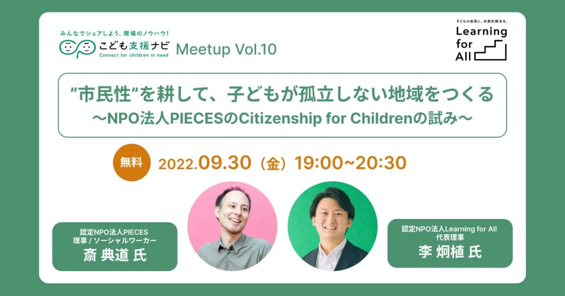 子どもに向き合う全国各地の支援者が繋がり、学び、支え合う取組を広げていくため、ゲストをお招きしながら学び/知見/意見をシェアするイベント「こども支援ナビ Meetup」にPIECES理事・事務局長の斎が登壇します。