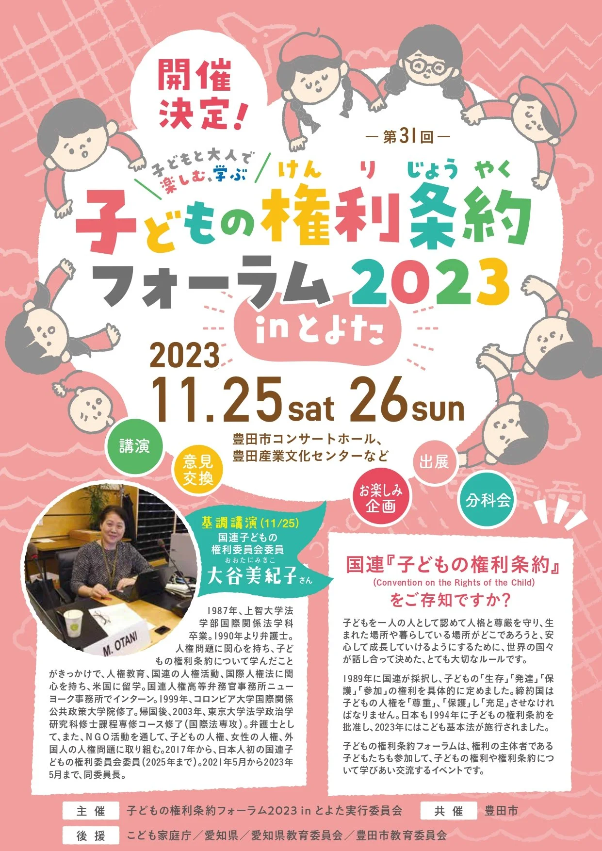 11月25日~26日で開催される「子どもの権利条約フォーラム2023 in とよた」の分科会に、「広げよう!子どもの権利条約キャンペーン」の実行委員としてPIECESが参加します。