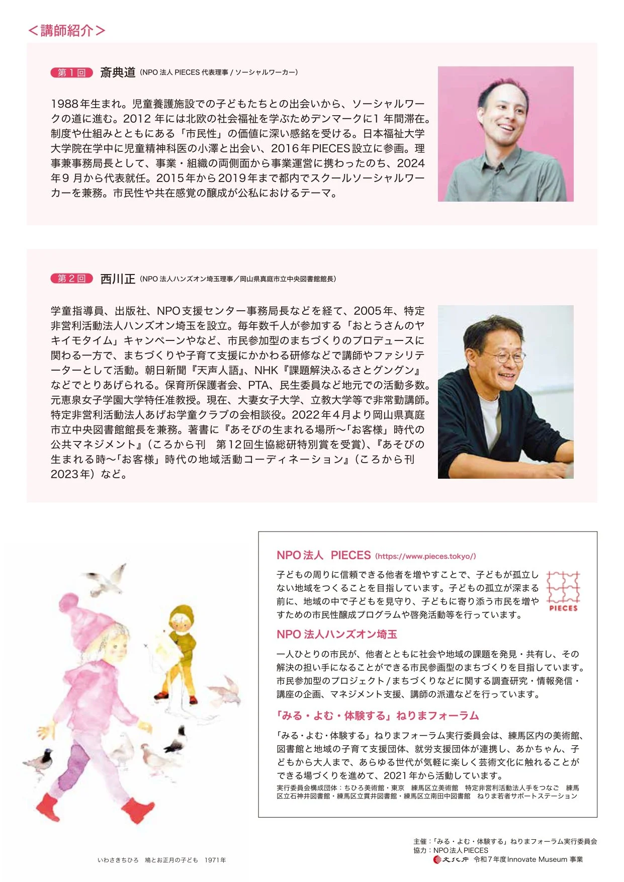 ※PIECESは、ちひろ美術館・東京が中核館をつとめる「みる・よむ・体験する」ねりまフォーラムが主催する講座「子どもにやさしいまちづくり」をコーディネートしています。
