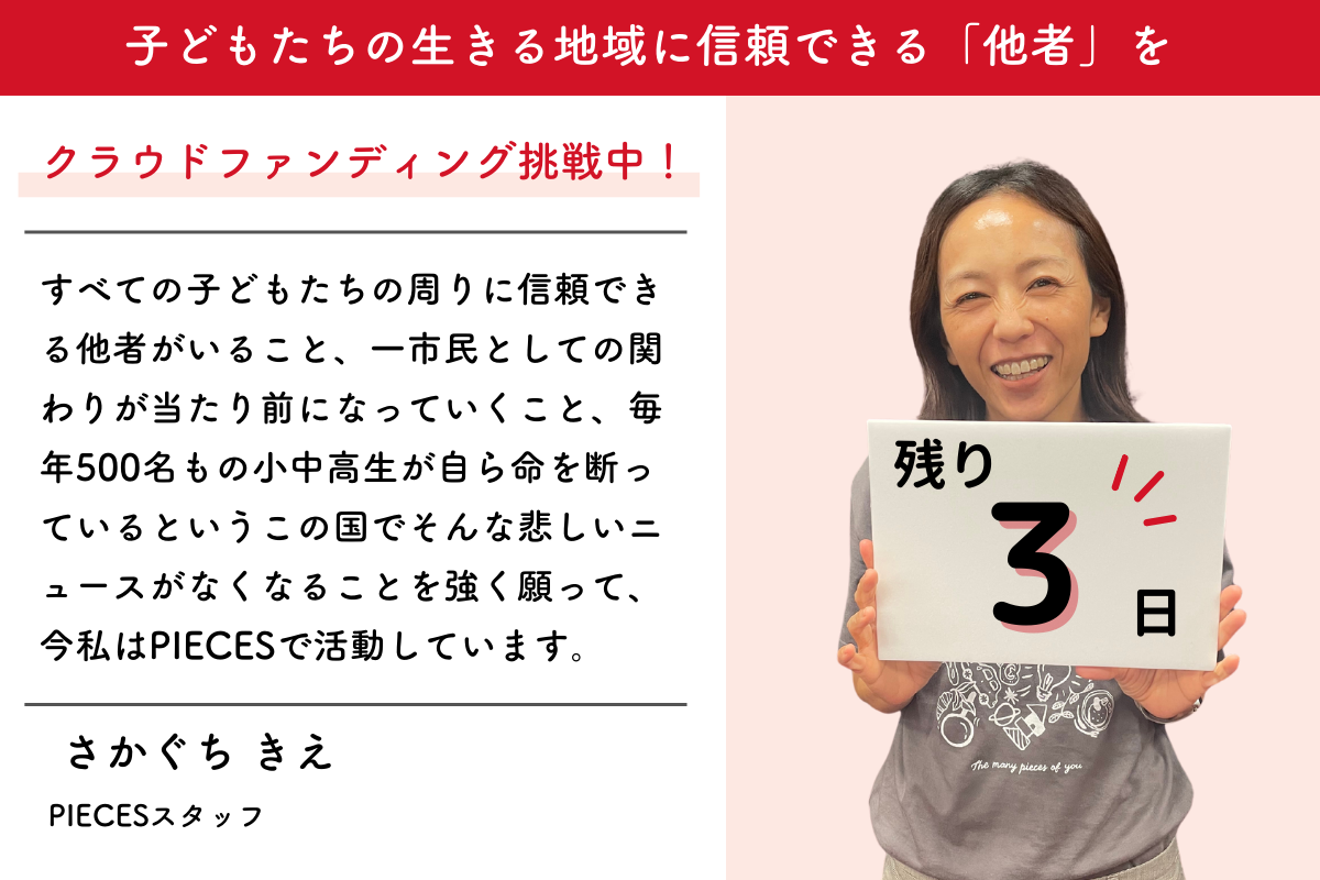 すべての子どもたちの周りに信頼できる他者がいること、一市民としての関わりが当たり前になっていくこと、毎年500名もの小中高生が自ら命を断っているというこの国でそんな悲しいニュースがなくなることを強く願って、今私はPIECESで活動しています。