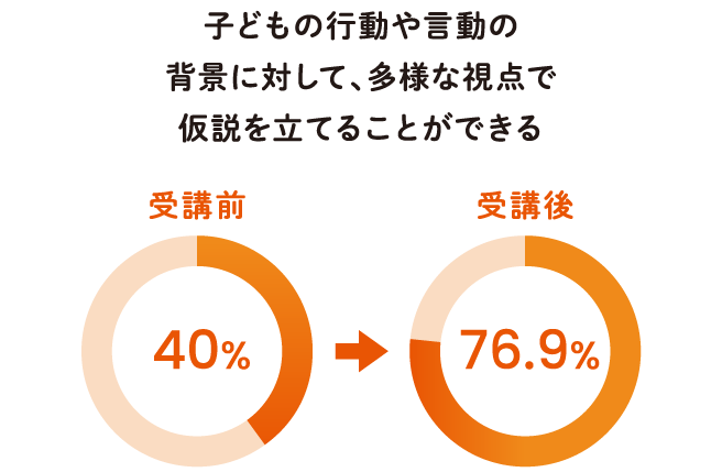 ●子どもにかかわろうとする際に、子どもの願いに目をむけるようになった。特に、自分がかかわるときの姿勢が子どもにはどのように受け取られるか?という視点をより強く意識するようになった。(25-34歳、大学生)
