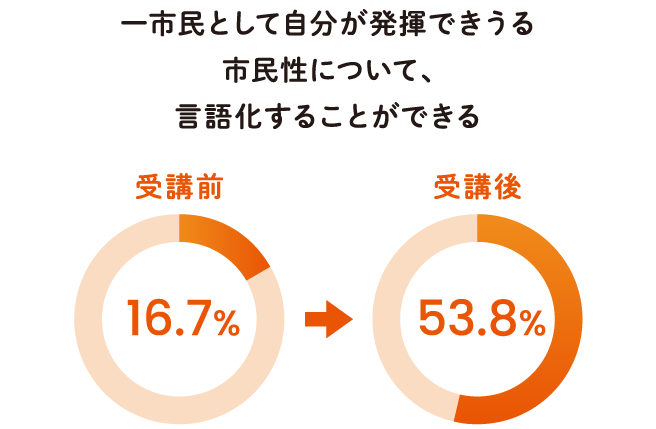 ●まず、行動を起こしてみようという考えにかわった。以前は、イチから団体や活動を作ることばかり考えていたけど、いま目の前にいる子どもや人々を自分にできる範囲で手助けすればいいと考えるようになった。(35-44歳、会社員)
