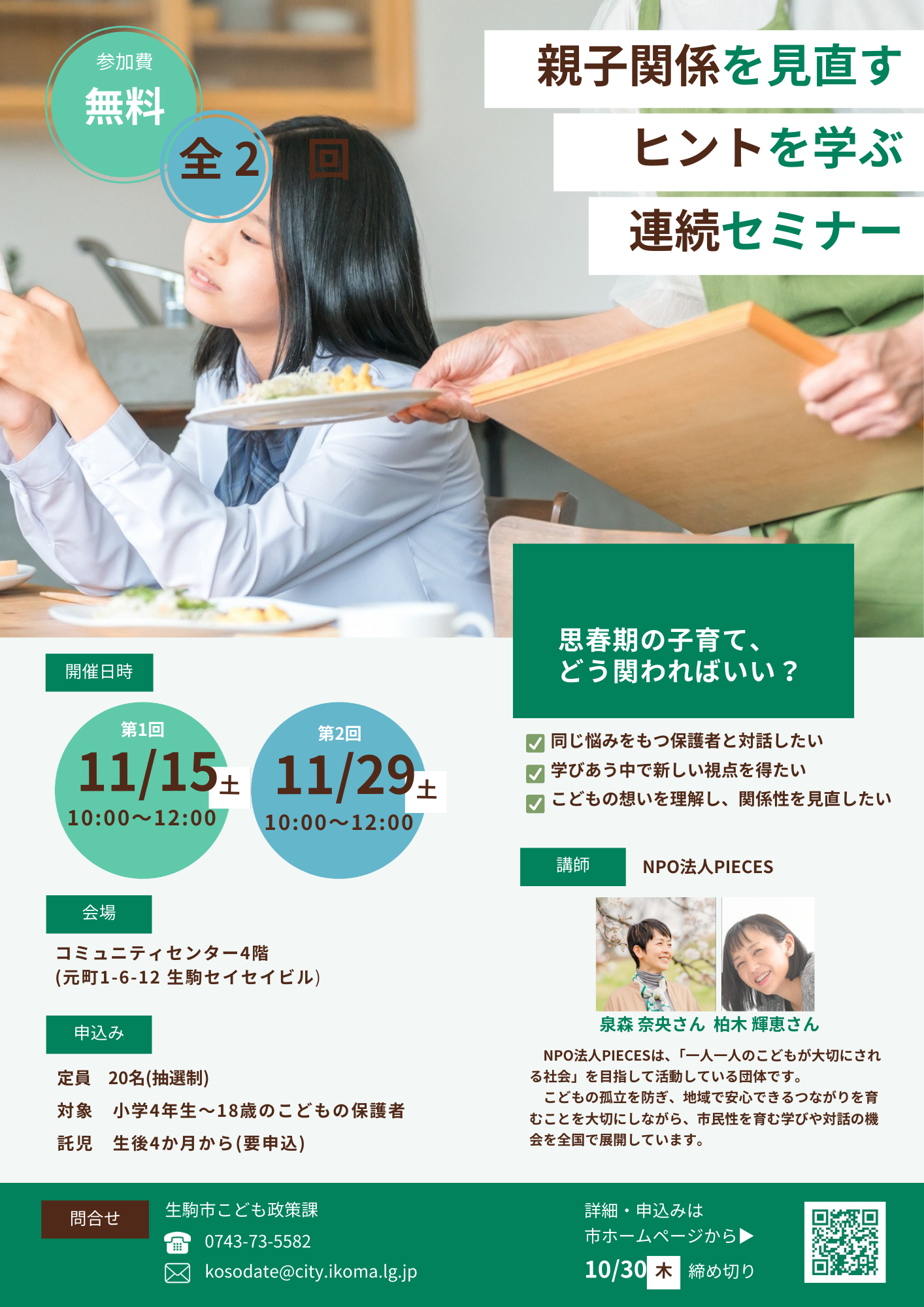 奈良県生駒市こども政策課よりご依頼をいただき、「親子関係を見直すヒントを学ぶ連続セミナー(思春期のこどもの保護者向け連続講座/全2回」を開催しました。
