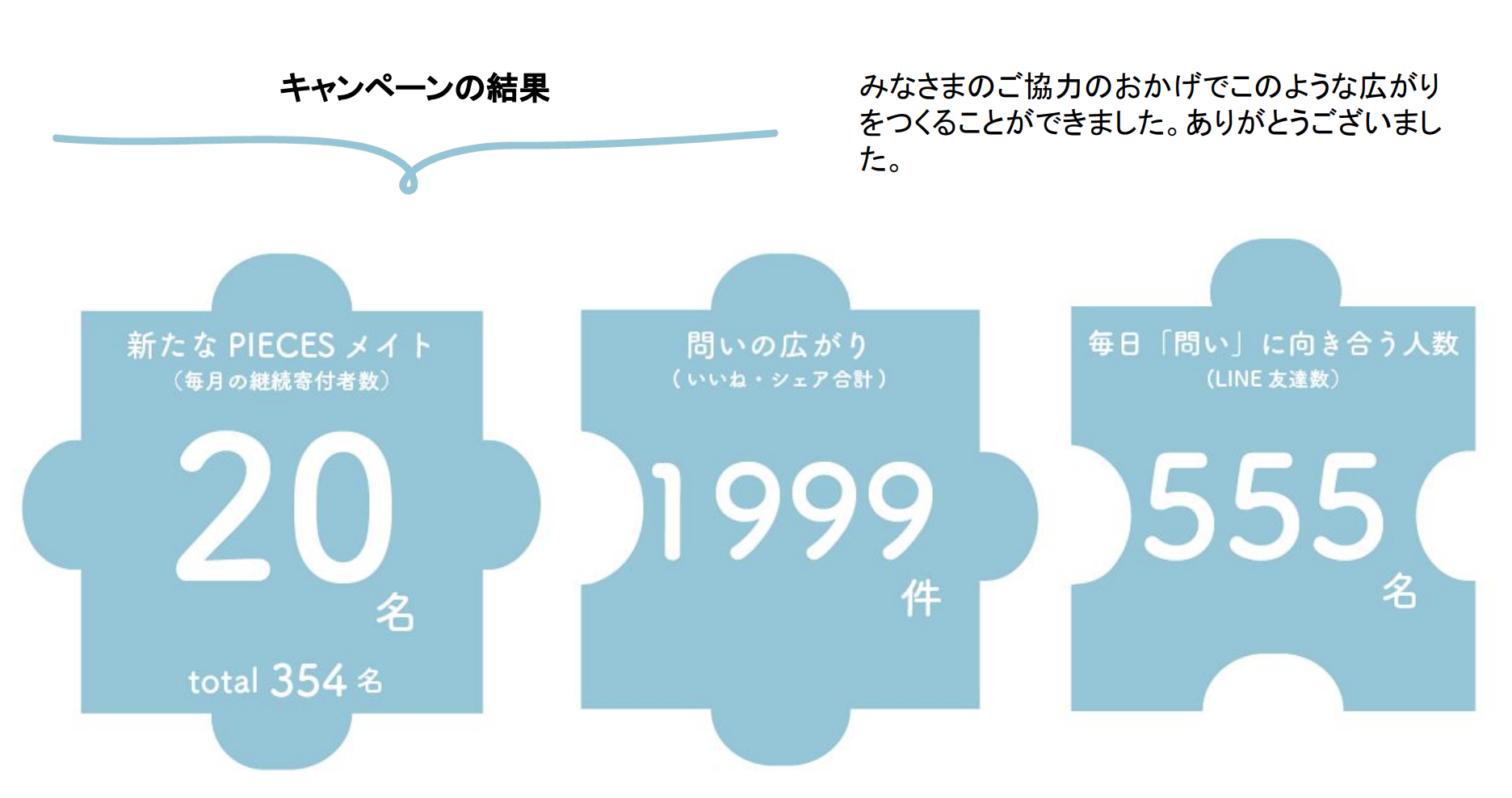 SNSなどを通じて、著名人の方々やPIECESから毎日1つの「問い」を発信。新たに20名のPIECESメイトが増え、シェアやいいねでのご協力は1999件いただくことができました。PIECES公式LINEもスタートし、555名の方が登録くださり、「優しい間」をひろげることができました。