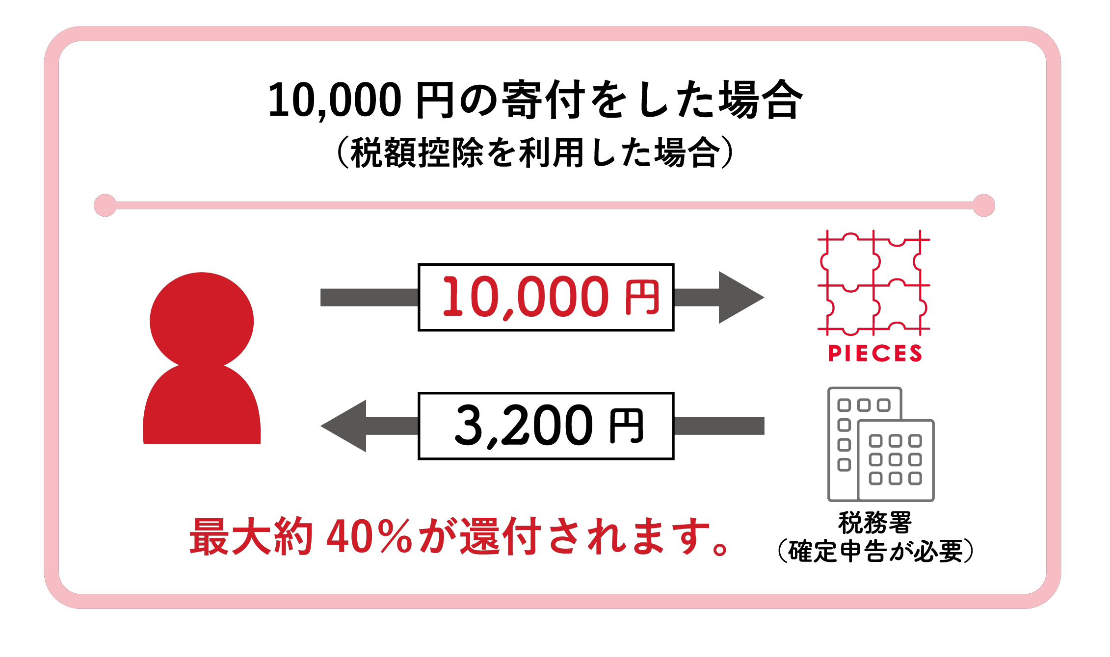 PIECESへのご寄付は寄付金控除などの税の優遇措置の対象となります。毎年1月に前年度分のご寄付に対する領収書をまとめて郵送いたします。