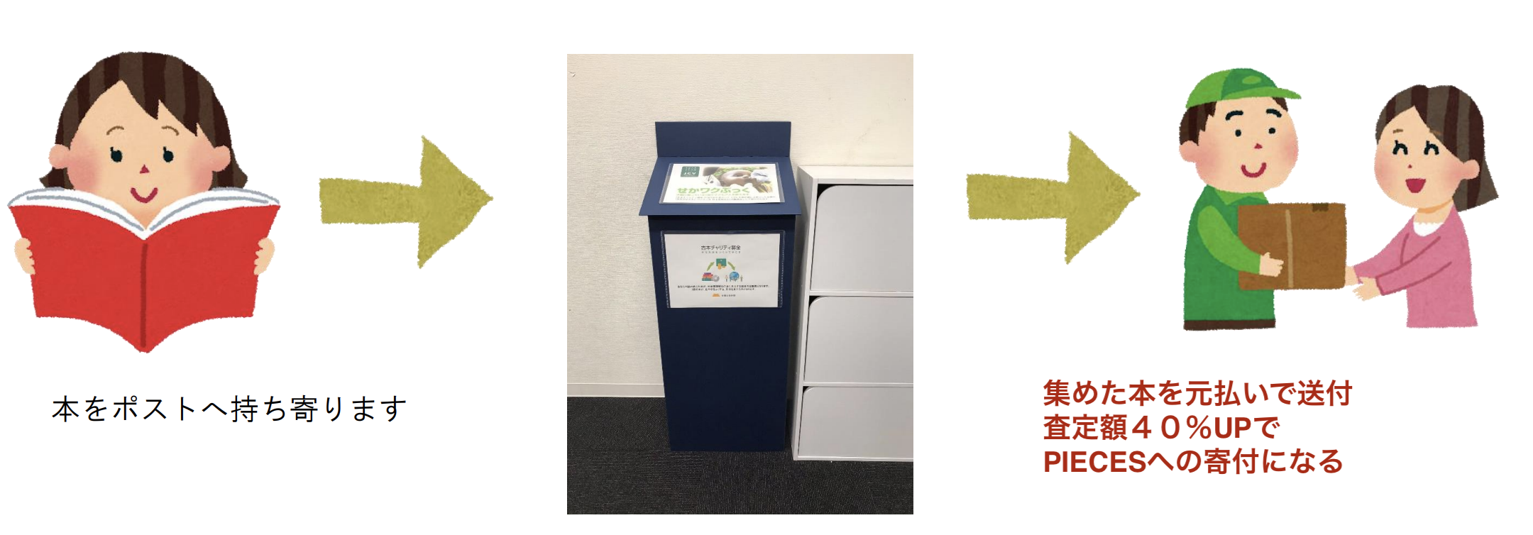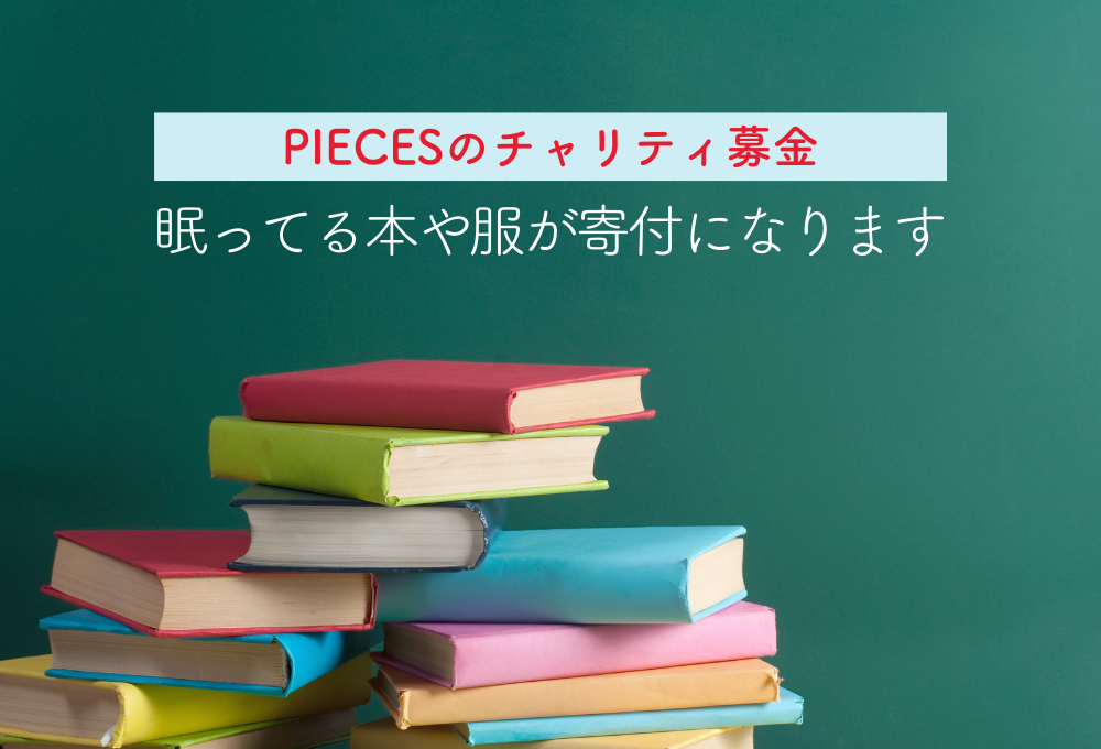 PIECESでは、株式会社ブギ 本棚お助け隊 さまの協力のもと、古本や古着などを活用したご寄付を受け付けています。