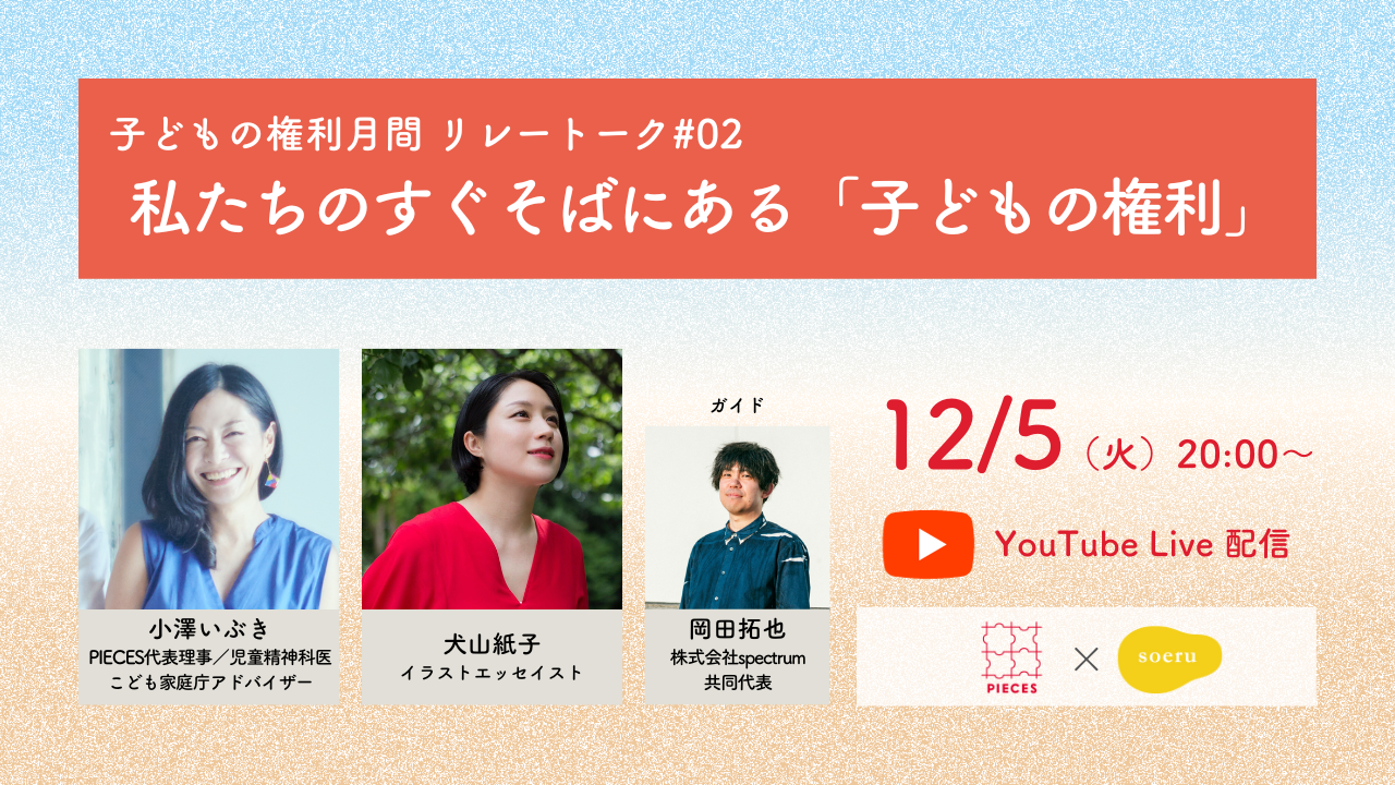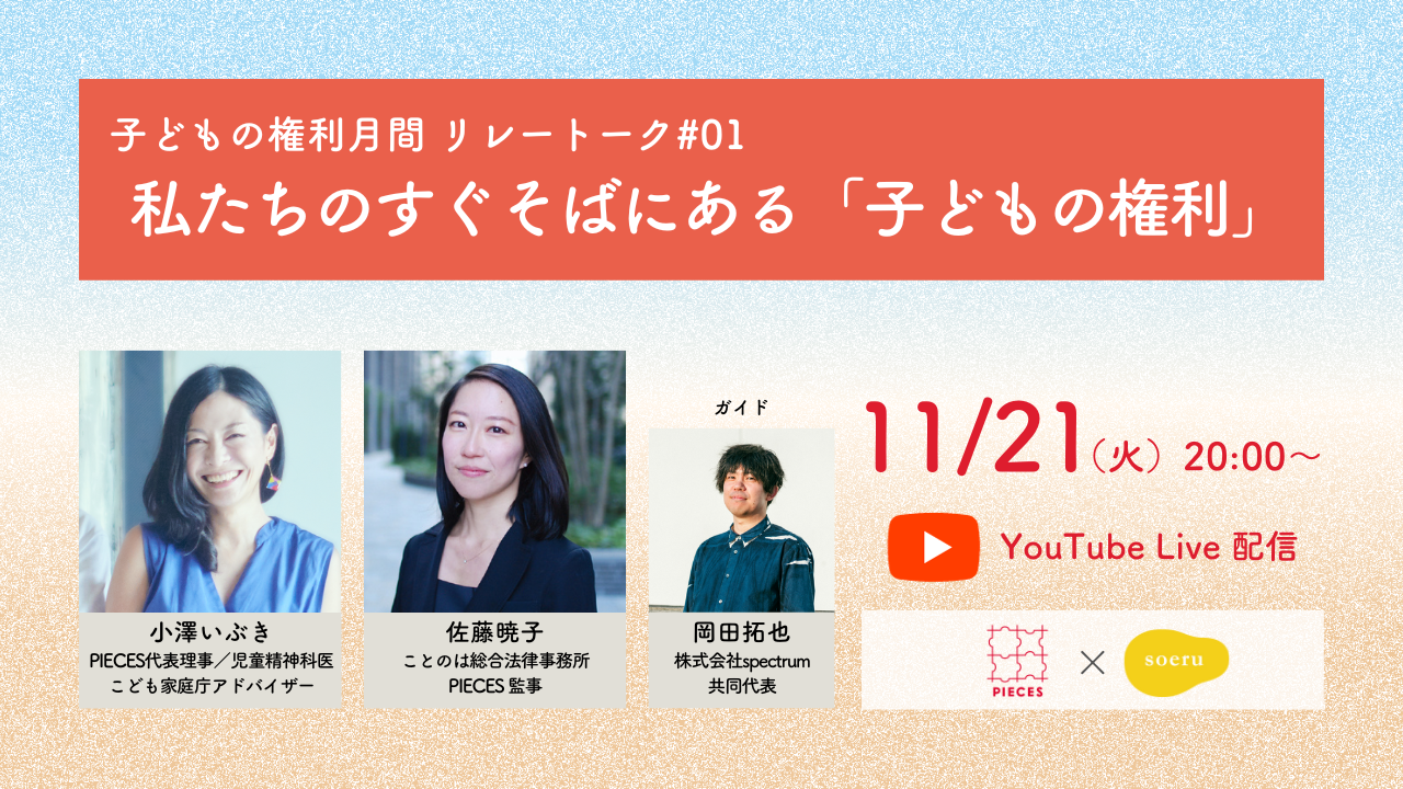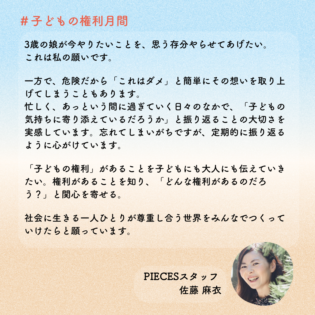 子どもは尊厳ある一人の人。尊厳ある一人の権利主体として、子どもたちがこの社会で生きていく環境を子どもとともにつくることは、おとなや社会の大切な役割です。 PIECESはこれからも子どももおとなも尊厳が大切にされる社会を目指していきます。